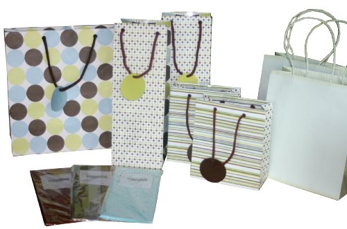 - Includes 1 large office graphics gift bag with brown, lime, and light blue dots on white